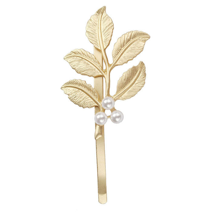 1X Lovely Pearl Embellishment Hair Clip Accessories Gold Leaves Hairpin(Without retail package)